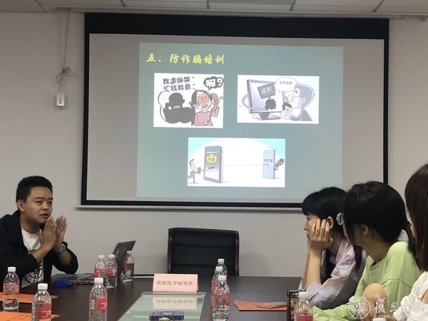 新生自我介绍环节中,每位新生就专业、导师、本科院校、兴趣爱好等展开介绍。导师们兴致勃勃地倾听同学们的故事,不时发起热烈的讨论,把整场会议的气氛推向高潮。大家在热情、轻松的交谈中拉近了距离,增加了对彼此的了解。随后,各位导师向新生介绍各自课题组的研究情况。陈红红、孔肇路、韩俊斌、谢添武、朱国英、邵春林、卓维海、华国强依次介绍了他们的主要研究方向,表达了对同学们的殷切期望。每个研究方向都不是孤立的,它们互相交织,共同组成了“放射医学”这个学科。因此,导师们鼓励大家多交流、多互动,不要局限于各自导师的研究方向,对于有志在多个方向发展的同学,导师们一定会鼎力相助。