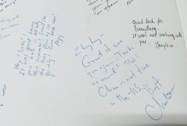 右上角为2002年袁正宏访问结束时赖斯的留言。在赖斯印象中,袁正宏是个精力旺盛的人,所以称他Turbo