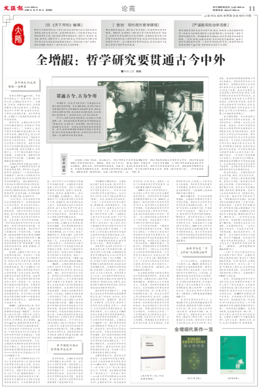 在哲学领域,全增嘏是我国建立学位制度以来全国第一批、也是复旦大学哲学系第一位获得博士生导师资格的教授。尽管全增嘏留下的哲学著述不多,无法全面展现他深厚的学术造诣,但这无损于他在国内哲学界的地位和声望,他在西方哲学史、现代西方哲学等研究领域都发挥了奠基性的作用。