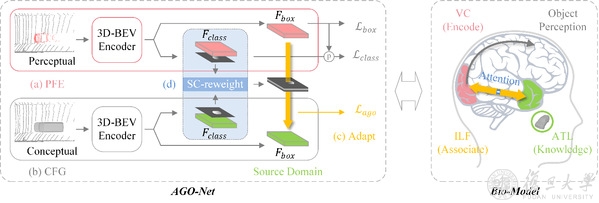研究团队给出了AGO-Net的网络结构以及其背后对应的生物模型(图2)。据介绍,红色框内的PFE是真实场景点云的特征编码网络;对于灰色框内的CFG,算法首先利用同源点云数据补全不完整的目标点云,生成概念场景,再提取特征,该特征提取模块将被预先训练好,最后在训练整体网络时固定权值,提供稳定的完整目标特征;黄色标出的部分是特征关联模块,通过域适配算法优化缩减两个高维编码的特征距离,实现特征关联;网络训练完成以后,只需使用PFE就可以进行网络的推理预测。