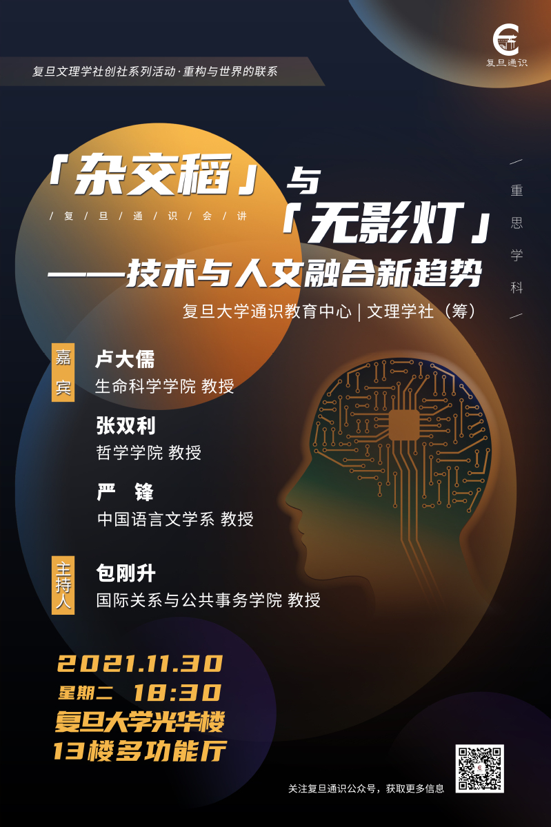 类 型:讲座 校 区:邯郸校区 主 题:复旦通识会讲 | [杂交稻]与[无影灯]——技术与人文融合新趋势 日 期:2021-11-30 时 间:18:30 主讲嘉宾:卢大儒、张双利、严锋、包刚升 地 点:13楼多功能厅 主办方:通识教育中心 承办方:议 程: 附 件: