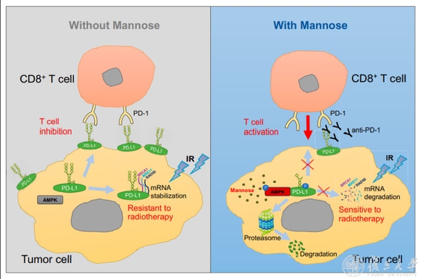 2022年2月22日,复旦大学基础医学院生化系代谢分子医学教育部重点实验室吕雷团队与同济大学徐艳萍团队和南开大学张松团队联合在PNAS上发表了题为D-mannose facilitates immunotherapy and radiotherapy of triple-negative breast cancer via degradation of PD-L1的研究成果。该研究揭示了D-甘露糖可以通过影响PD-L1的糖基化促进其降解,进而提升TNBC免疫治疗和放疗的疗效。