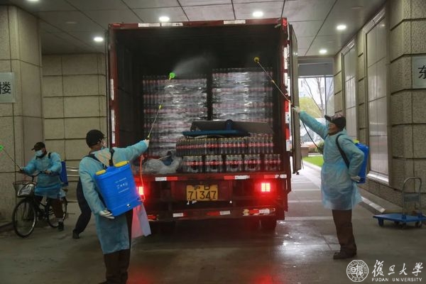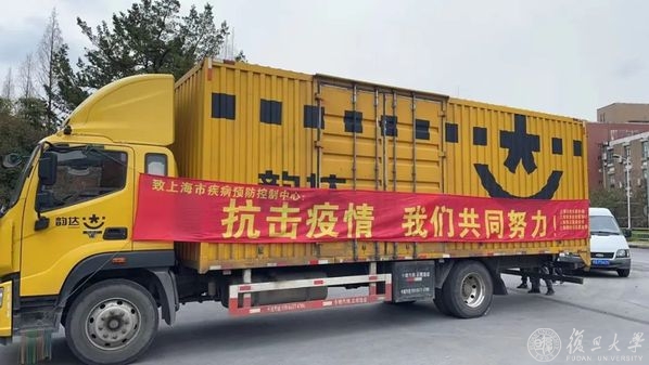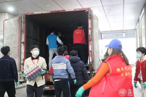 下午4点,10辆满载物资和满溢“她力量”的货车如数抵达复旦大学校门。