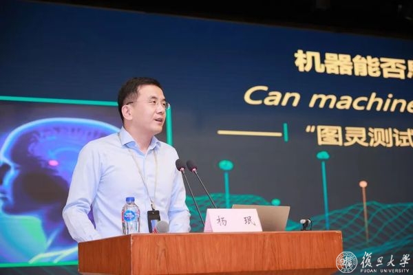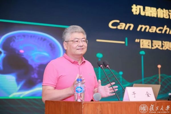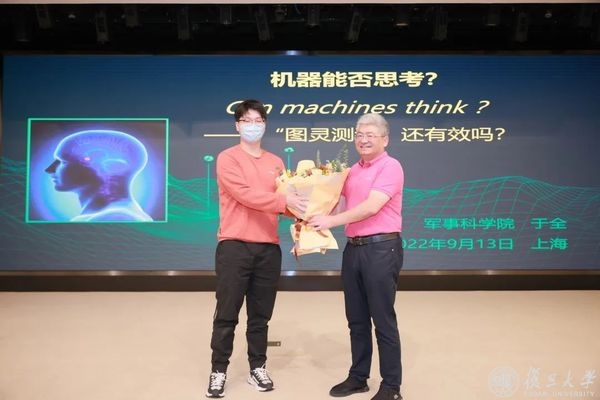 副校长汪源源教授致欢迎辞。随后,于全院士带来精彩报告,对图灵于1950年发表的论文《计算机器与智能》进行了全面解读。众所周知,图灵在现代计算机科学领域做出了巨大贡献,被誉为人工智能之父,他在该论文中提出了著名的图灵测试,并从神学、伦理、数学、哲学、能力、创新、生物、人性、超灵这九大质疑观点加以论证。长期以来,这一测试被认为是判断机器思考能力的一个标准,但漫长的发展历程中出现了大量的“伪图灵测试”迷惑视线。于院士通过一系列思考和分享,全方位多角度地认知和解读了图灵猜想,并以“机器能否思考”这个关乎科学问题、哲学问题、人类终极命运的问题对未来计算机科学发展的引领进行展望。最后于院士对复旦学子提出希冀,希望大家能独立思考,以批判思维、开放包容的态度面对世界和人生,这也是在复旦学习中最有意义的事情。