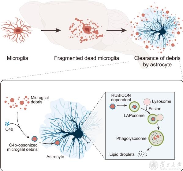 进一步,该团队探索了星形胶质细胞吞噬和降解小胶质细胞碎片的机制,发现补体C4b能促进星形胶质细胞对小胶质细胞碎片的吞噬作用。而在星形胶质细胞体内,小胶质细胞碎片通过RUBICON依赖的非经典自噬途径(又称为LC3相关胞吞作用)进行降解。