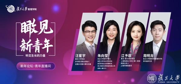 2023复旦管院新年论坛特别设置第二现场“瞰见新青年”,以“听见生长的力量”为主题,邀请到四位复旦优秀青年代表与大家分享自己的理想与人生、事业与生活。