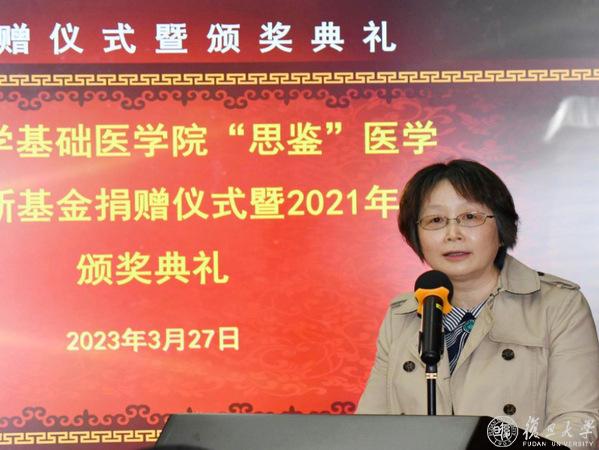 张艳萍代表上医向“思鉴”医学科教基金创始人郑思競教授和共同创始人左焕琛教授致以最崇高的敬意;向始终关心支持“思鉴”基金的所有捐赠人表示最衷心的感谢;同时向本届获奖师生表示热烈祝贺。她希望“思鉴”医学科教创新基金加强宣传、扩大影响,进一步向学界与全社会普及医学科教创新理念,吸引更多捐赠,点燃每份心愿,共同构筑关爱人民生命的共同体。希望大家始终秉承“团结、服务、牺牲”的复旦精神,牢记“正谊明道”的上医院训,为加快建设“第一个复旦”,推动医学教育事业高质量发展,早日实现中国式现代化作出应有贡献。