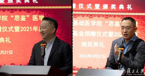 捐赠方代表章滨云先生、叶崴涛先生分别致辞,他们表示,作为上医校友,看到上医的每一点进步都感到无比骄傲和自豪。近年来,国家高度重视基础学科的发展,由衷希望自己可以为复旦上医基础医学的发展贡献力量,也衷心祝愿母校越办越好。