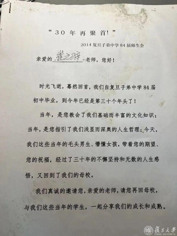 复旦子弟中学1984届师生会发给崔之骍的邀请函