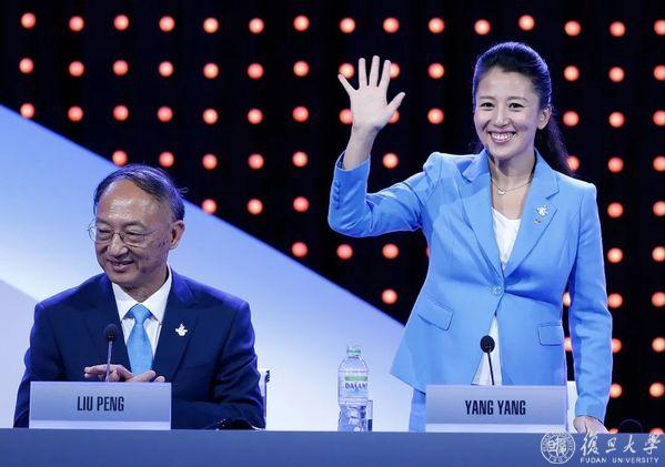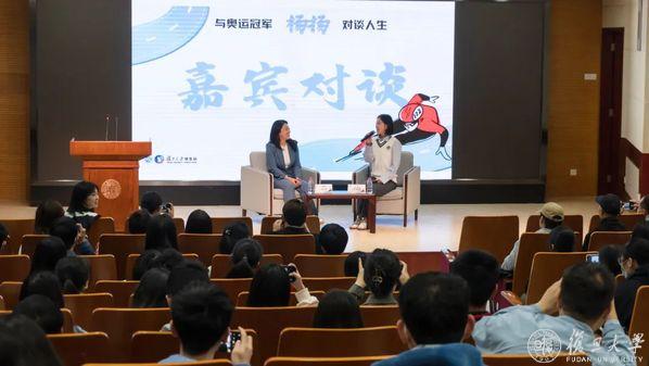 身着一袭蓝色西装套装和白色运动鞋,杨扬以轻盈姿态走上台,笑意盈盈。“非常高兴能再次来到复旦,每次走进校园,心情都特别愉悦。希望通过体育交流,和大家共同成长。”她说道。