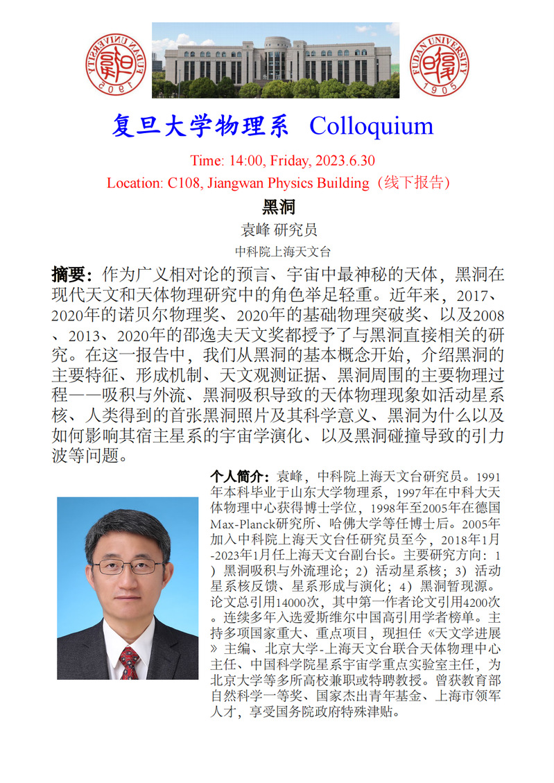 类 型:学术会议 校 区:江湾校区 主 题:黑洞 日 期:2023-06-30 时 间:14:00 主讲嘉宾:袁峰教授 地 点:c108,Jiangwan Physics Building 主办方:复旦大学物理系 承办方:议 程: 附 件: