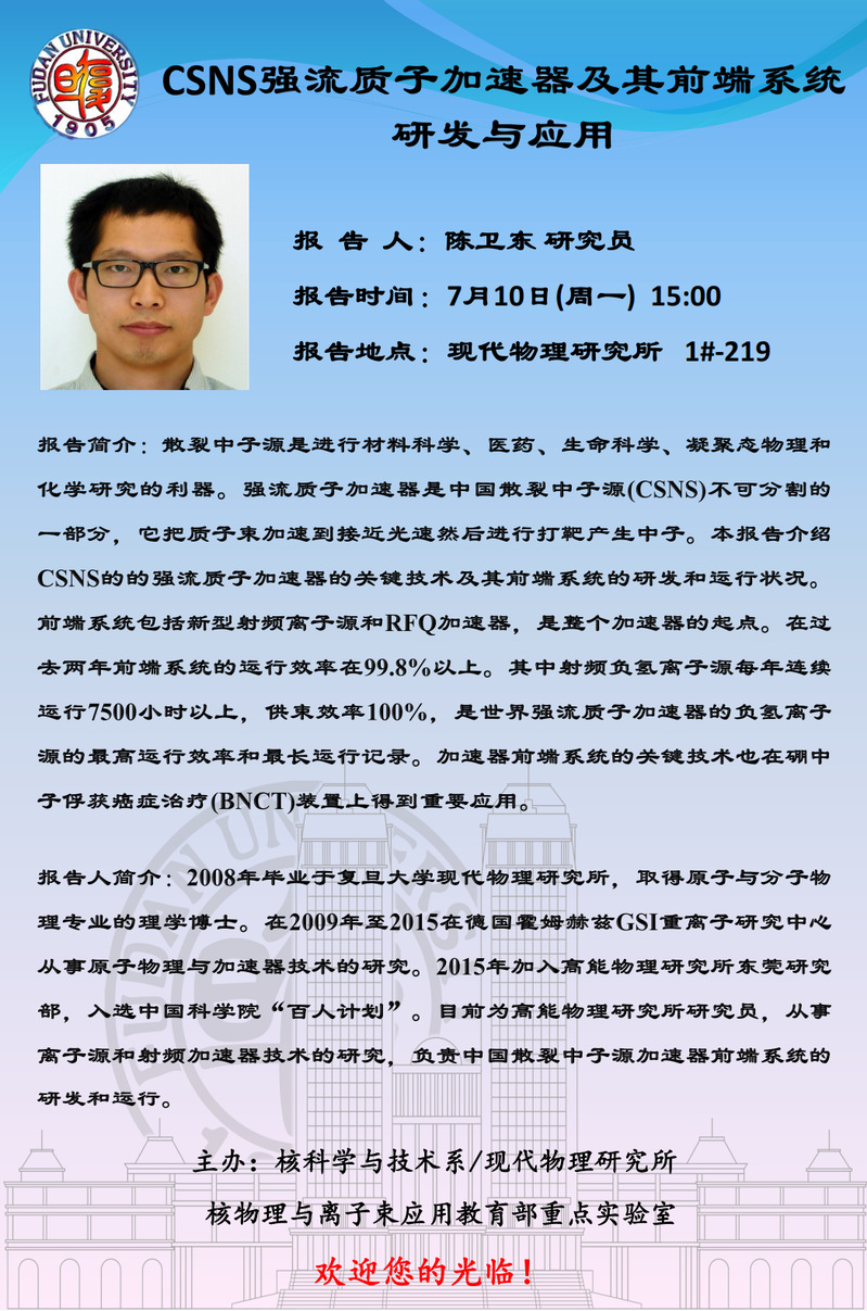 类 型:讲座 校 区:邯郸校区 主 题:CSNS强流质子加速器及其前端系统研发与应用 日 期:2023-07-10 时 间:15:00 主讲嘉宾:陈卫东研究员 地 点:现代物理研究所 1#·219 主办方:核科学与技术系/现代物理研究所 承办方:议 程: 附 件: