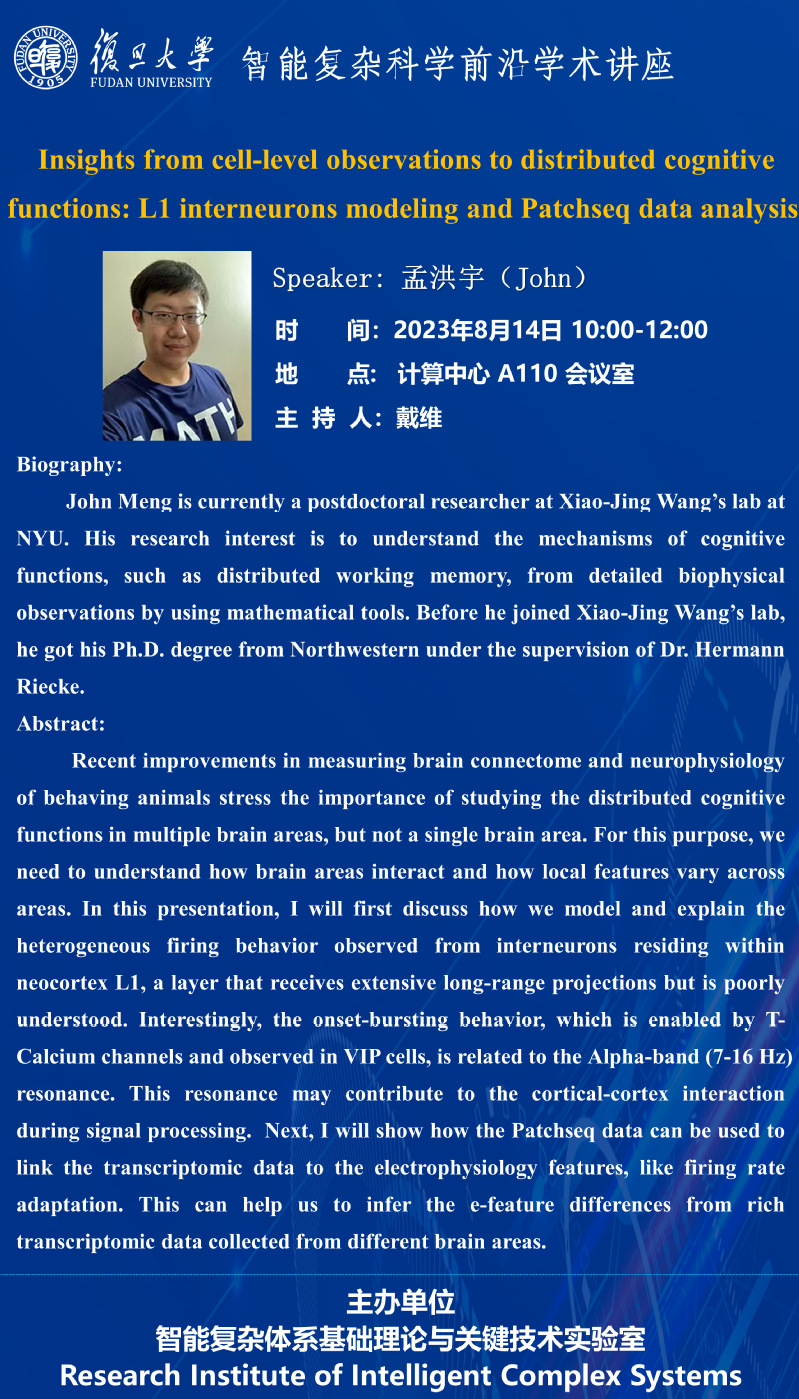 主 题:Insights from cell-level observations to distributed cognitive functions: L1 interneurons modeling and Patchseg data analysis