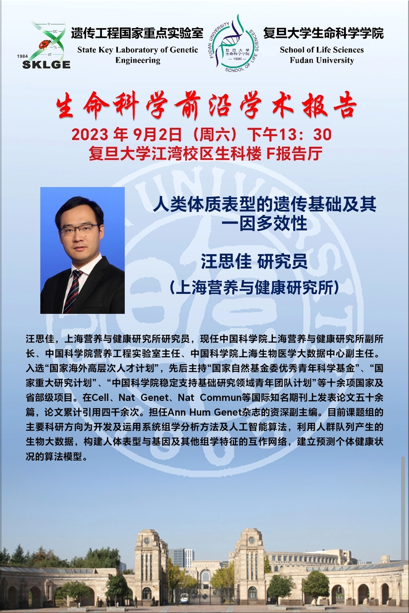 类 型:学科周 校 区:江湾校区 主 题:学科周 | 人类体质表型的遗传基础及其一因多效性 日 期:2023-09-02 时 间:下午13:30 主讲嘉宾:汪思佳 研究员 地 点:生科楼F报告厅 主办方:生命科学学院 承办方:议 程: 附 件: