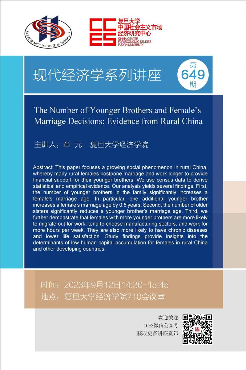 主 题:现代经济学系列讲座第649期丨The Number of Younger Brothers and Female's Marriage Decisions: Evidence from Rural China