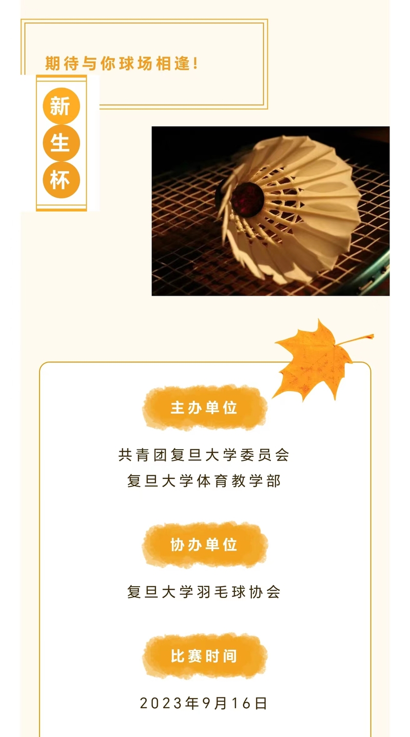 类 型:体育 校 区:江湾校区 主 题:新生杯—秋风渐起,“羽”君相逢 日 期:2023-09-16 时 间: 主讲嘉宾: 地 点:江湾体育馆三楼羽毛球场 主办方:共青团复旦大学委员会、复旦大学体育教学部 承办方:议 程: 附 件:
