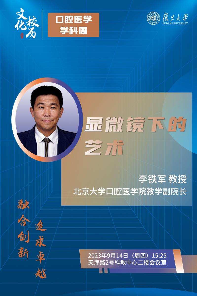 类 型:学科周 校 区:邯郸校区 主 题:口腔医学学科周丨显微镜下的艺术 日 期:2023-09-14 时 间:15:25 主讲嘉宾:李铁军教授 地 点:天津路2号科教中心二楼会议室 主办方:复旦大学口腔医学系 承办方:议 程: 附 件: