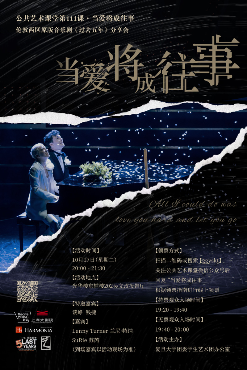 类 型:活动 校 区:邯郸校区 主 题:公共艺术课堂第111课·当爱将成往事——伦敦西区原版音乐剧《过去五年》分享会 日 期:2023-10-17 时 间:20:00-21:30 主讲嘉宾:Lenny Turner 兰尼·特纳、SuRie 苏芮、谈峥、钱捷 地 点:光华路东辅楼202吴文政报告厅 主办方:复旦大学团委学生艺术团办公室 承办方:议 程: 附 件: