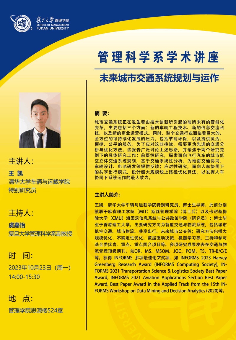 类 型:讲座 校 区:邯郸校区 主 题:未来城市交通系统规划与运作 日 期:2023-10-23 时 间:14:00-15:30 主讲嘉宾:王凯 地 点:管理学院思源楼524室 主办方:复旦大学管理学院 承办方:议 程: 附 件: