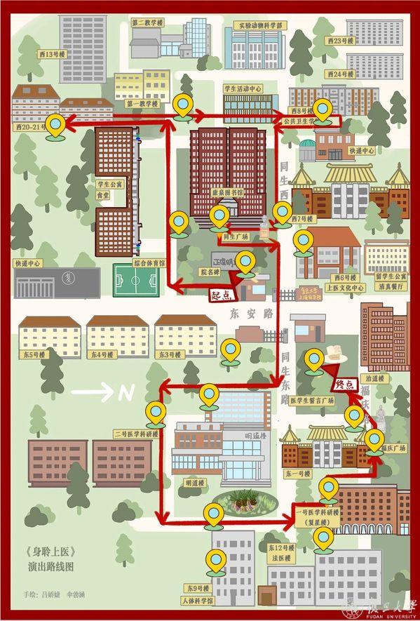 演出起点为东安路130号西苑院名碑,终点为东安路131号东苑医学生誓言碑。如一次性完成聆听全场演出时长约为80分钟左右,观众需全程步行,路程约为2公里,请穿戴便于行走的衣物鞋履。每个位点也可单独聆听。