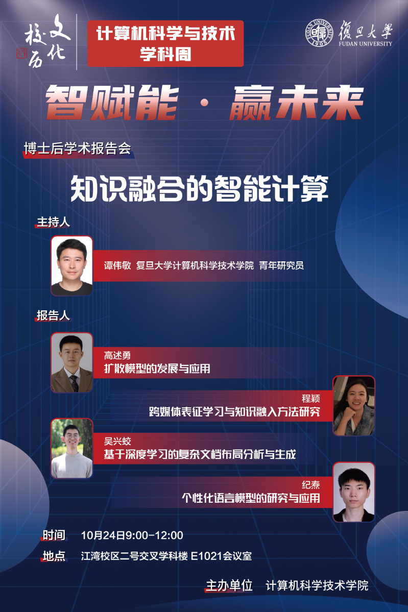 类 型:学术会议 校 区:江湾校区 主 题:知识融合的智能计算 日 期:2023-10-24 时 间:9:00-12:00 主讲嘉宾:高述勇、程颖、吴兴蛟、纪焘 地 点:二号交叉学科楼E1021 主办方:计算机科学技术学院 承办方:议 程: 附 件: