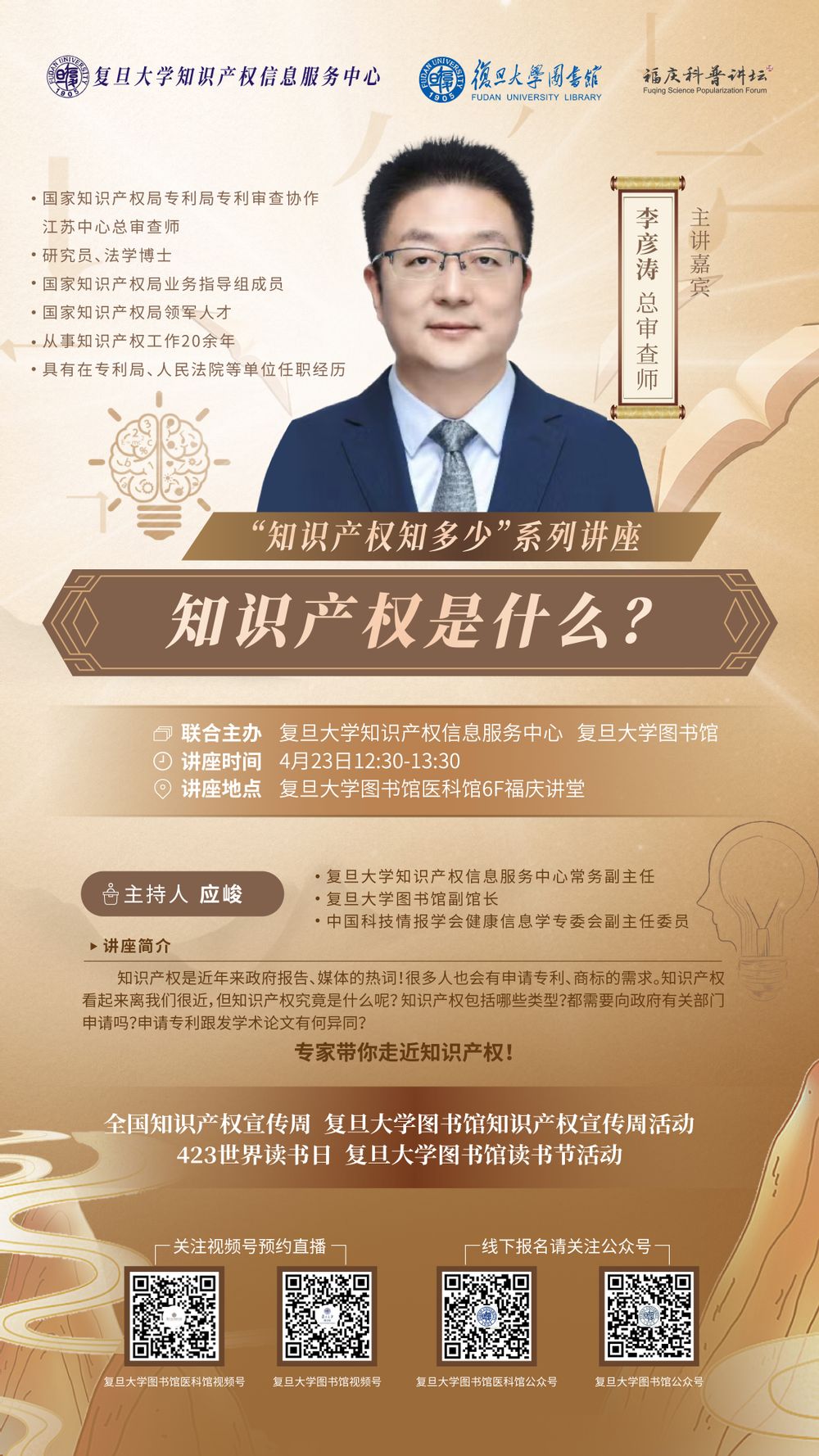 主题:福庆科普讲坛之复旦大学知识产权宣传周暨复旦大学图书馆读书节活动 李彦涛《知识产权是什么?》