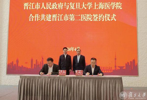下午,复旦大学上海医学院与晋江市人民政府正式签署合作共建晋江市第二医院协议,成立复旦大学上海医学院晋江医学发展中心。泉州市委常委、晋江市委书记张文贤,晋江市委副书记、市政府副市长吴志朴,晋江市委常委、市政府副市长张健龙,泉州卫健委主任苏松炎等出席签约仪式。