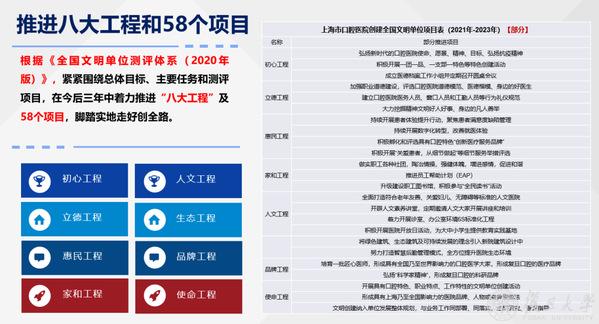 根植于上海市第一家公立口腔医疗机构的文化底蕴,口腔医院致力于用习近平新时代中国特色社会主义思想教育人,用社会主义核心价值观培育人,形成医院建设发展的精神支柱和精神动力。进入“十四五”以来,通过创全八大工程和58个具体项目、20个重点项目的实施,更加主动地提升软实力,助推医院高质量发展。项目推进率达到了100%,完成率达到85%。在精神文明建设和创全的过程中,项目制的实施能成为一种有效的管理方式——有效整合资源、明确各自目标、确保实施效果。通过精心策划和组织,项目制可以将社会主义核心价值观理念转化为具体的实践活动,把各项任务项目落到实处,全力提升管理模式、诊疗模式、运行模式和服务模式,达到去虚向实的效果,汇聚起全体干部员工的智慧与才干,充分发挥出软实力的“加速器”作用,为建设员工幸福、患者满意,高质量可持续发展的研究型医院而奋勇前进。