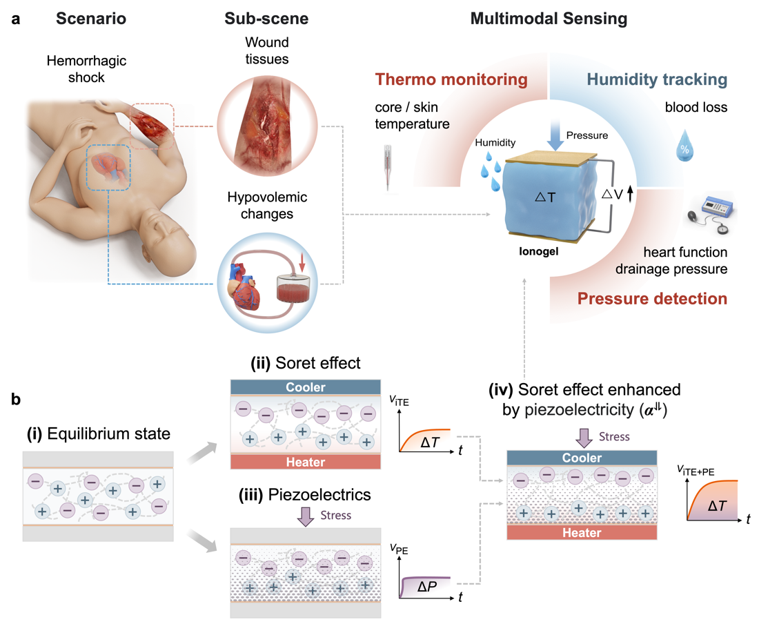 这种离子凝胶的双模态特性源于离子液体在温度梯度下产生的离子热电效应,以及PVDF基骨架的压电效应。该研究首次深入探讨了其"压电增强离子热电效应(PE-augmented iTEs)"的科学机理,当温度梯度与压力场同向建立时,不仅两种效应本身会产生电压,压电产生的内电场还进一步促进阴、阳离子的分化,使离子热电势呈现"1+1>2"的协同增强效应。当压电内电场与温度梯度同向时,n-型热电势从–4.4 提升至最高–6.9 mV K–1;此外,凝胶中水的存在显著增强离子输运,导致离子热电势受环境湿度影响,湿度越高,热电势越强。这种单一离子凝胶对温度、压力和湿度等环境参数的多维响应,恰好契合临床对多参数生命体征的传感需求,尤其在创伤休克等紧急医疗场景中尤为关键。