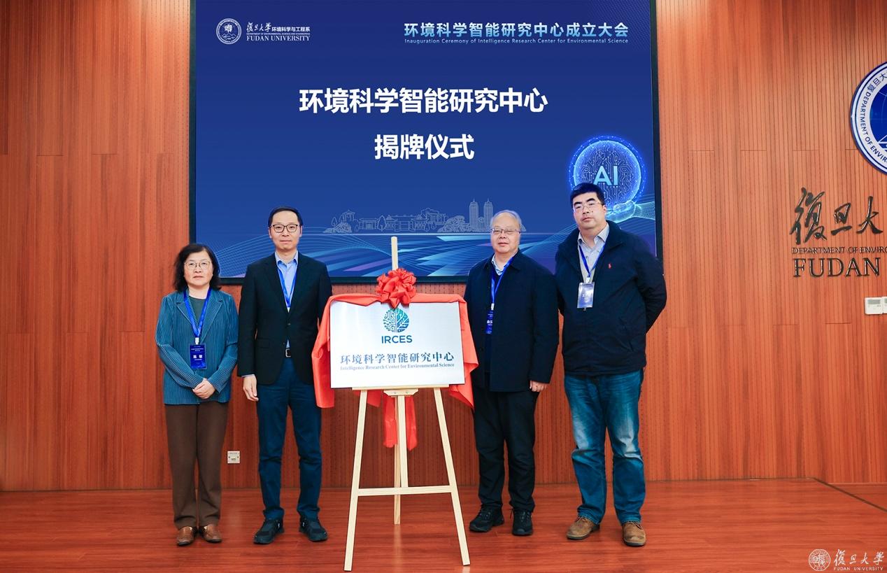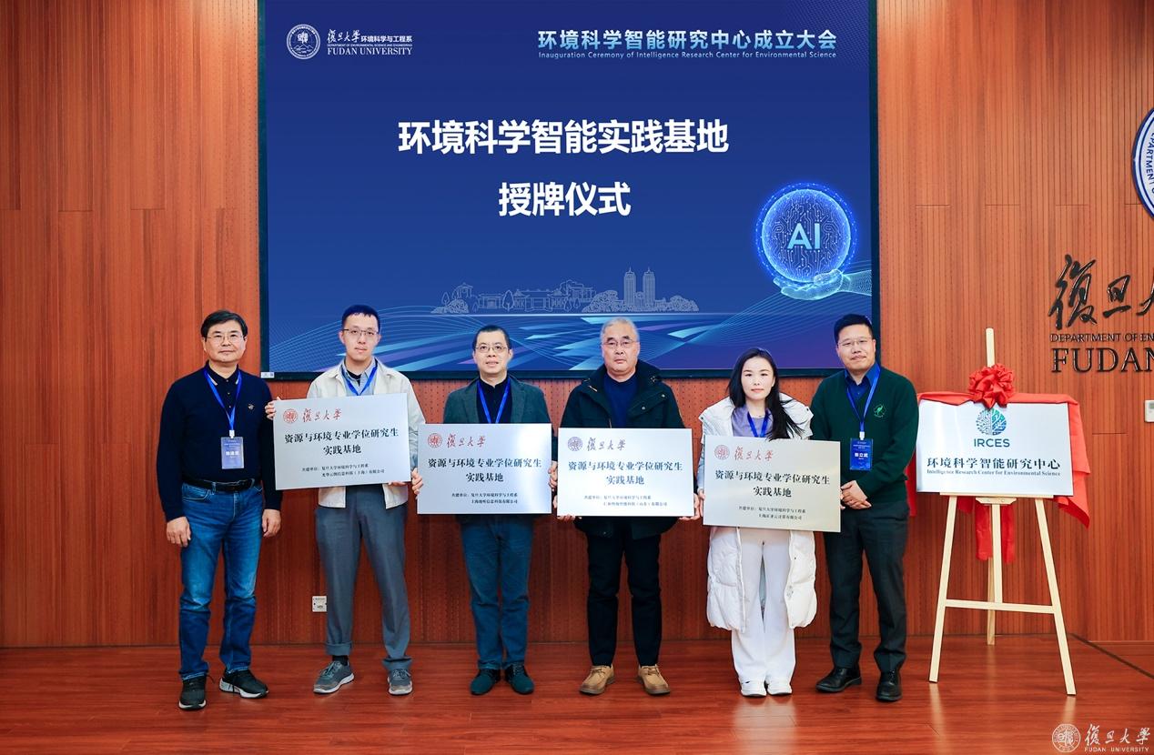 姜育刚、俞汉青、施敏、王琳共同为环境科学智能研究中心揭牌。四家人工智能领域科技企业和复旦环境系共建环境科学智能实践基地,启动产学研深度融合,陈建民教授、张立武副主任为四家企业授牌。