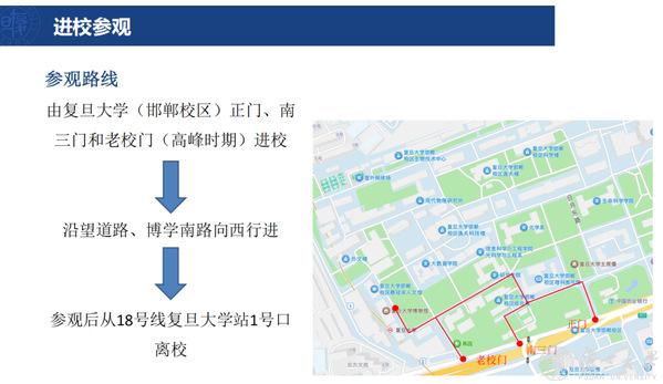 推荐参观路线为由复旦大学邯郸校区正门、南三门或老校门进校,沿望道路、博学南路向西行进,依次参观“复旦源”核心区域及“一源六馆”各场馆。结束参观后,可从新开设的18号线复旦大学站1号口离校。