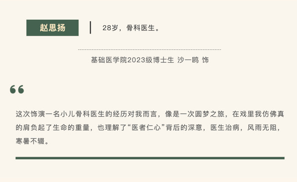 原创话剧《行走在大山深处的白衣天使》讲述的是上医“指点江山医疗队”和复旦上医博士生医疗服务团的故事。剧中分别选取1968年-1972年“指点江山医疗队”扎根贵州剑河,以及2004年、2014年、2024年博医团深入宁夏西吉、云南永平、四川北川、新疆喀什等地开展志愿医疗服务的故事,通过颜老师、梁向明等人物群像,展现了两代人穿越时空的精神对话,在“行走”的路上,他们对于上医精神的共鸣激励着他们不断前行,“爱国奉献,服务人群”的使命不断传承……在这场奉献接力中,每一代人都在书写着时代的答卷,“为人群服务,为强国奋斗”的精神,从未忘记!