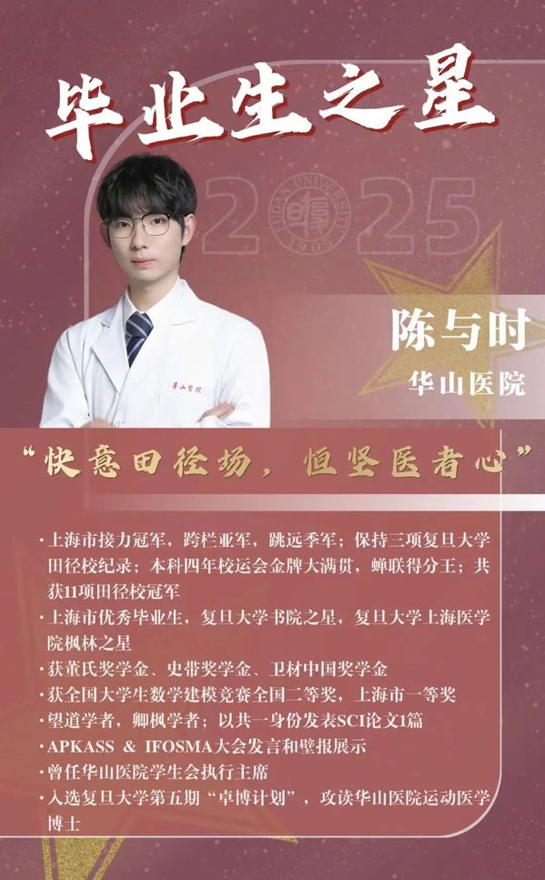 目前,陈与时入选复旦大学第五期“卓博计划”,将在华山医院继续攻读运动医学博士。未来,他将继续发扬运动精神,将赛道上每0.01秒的精进,延续为运动医学领域的毫米级突破。