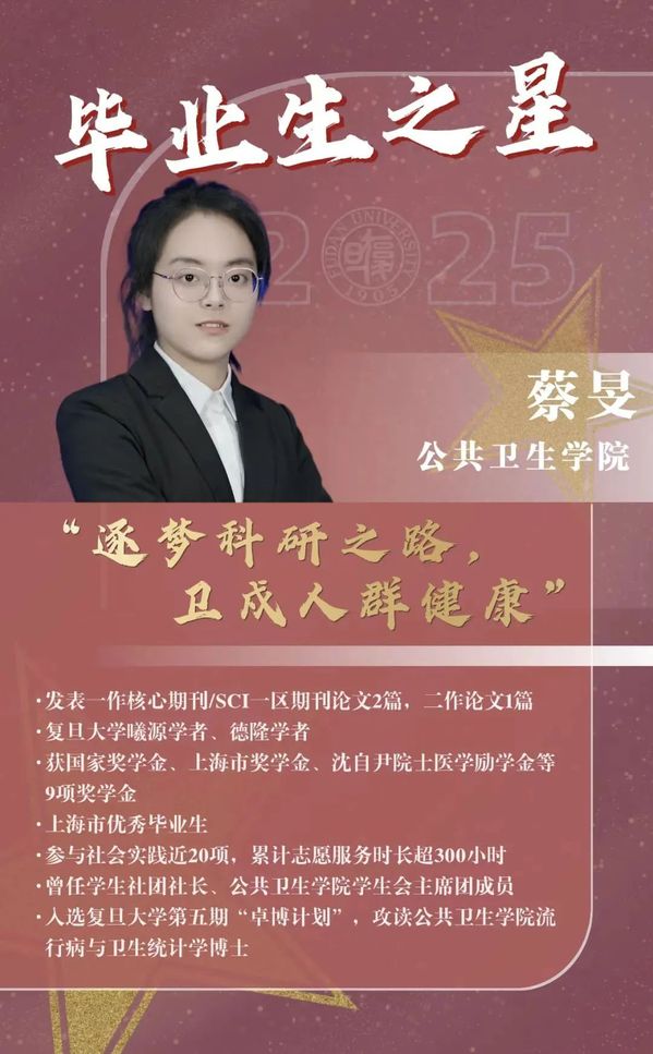 目前,蔡旻已入选复旦大学第五期“卓博计划”,毕业后,她将攻读流行病与卫生统计学博士,为守护人群健康贡献青春力量。