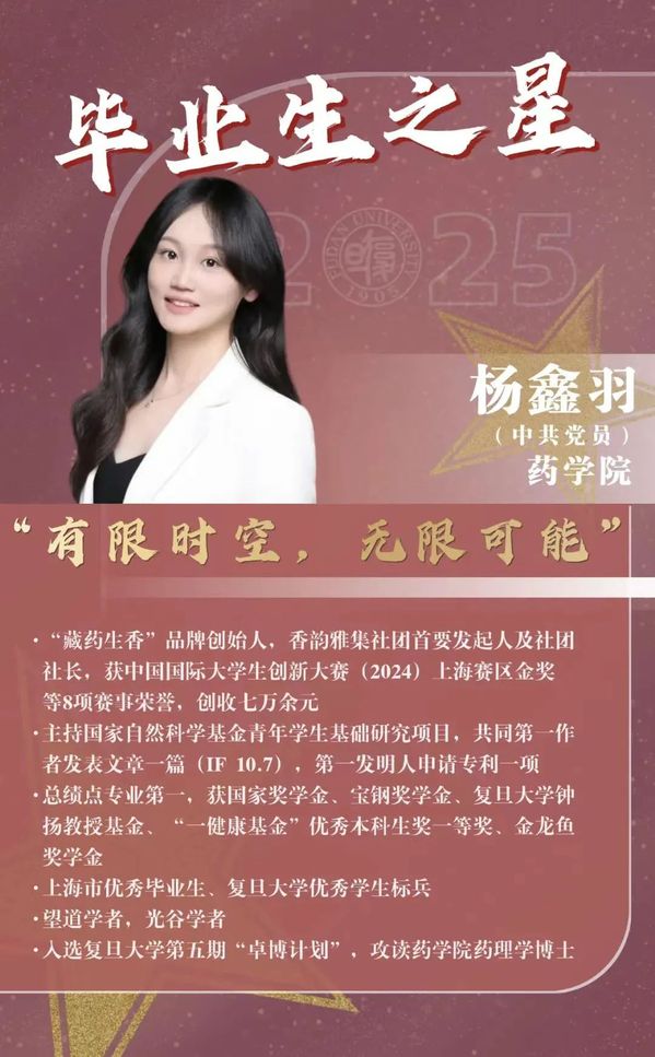 目前,杨鑫羽入选复旦大学第五期“卓博计划”,她将在基础医学院攻读药理学博士,继续在药物递送领域突破创新。