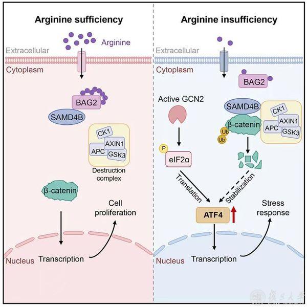 图:新的精氨酸感知机制-BAG2作为一种精氨酸感知蛋白,可直接结合精氨酸,在精氨酸缺乏时,释放SAMD4B进而调控β-catenin的降解并稳定ATF4