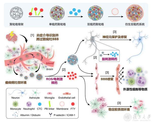 图:巨噬细胞膜仿生双载药聚吡咯系统的设计思路和治疗策略。[1]载药系统被巨噬细胞膜包裹后,能够在体内识别并结合炎症状态下的癫痫病灶血脑屏障,然后跨过血脑屏障进入病灶脑实质;[2]载药系统既能在胞外响应ROS和异常生物电刺激而加速释放芬戈莫德,又能被胞内溶酶体酸性环境刺激而释放胞磷胆碱钠;[3]载药系统一方面释放两种药物,另一方面能够清除病灶ROS,最终发挥保护和修复受损神经元、稳定胶质细胞微环境、恢复血脑屏障完整性的多重疗效。