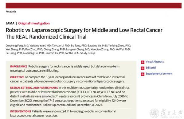 6月2日,复旦大学附属中山医院结直肠外科许剑民教授团队在《美国医学会杂志》(JAMA)上发表最新研究成果“Robotic vs Laparoscopic Surgery for Middle and Low Rectal Cancer”。该研究聚焦机器人辅助手术这一创新技术——主刀医生通过操控多个机械臂,经腹部操作孔在腹盆腔内实施手术。机械臂搭载的高清三维成像系统与可520°自由旋转的手术器械,其灵活度超越人类双手;同时,机器人系统能有效过滤术者手部不自主颤动,实现更精准稳定的操作。尽管机器人手术在操作精度和灵活性上展现出显著优势,但与传统腹腔镜手术的疗效差异仍需更充分的临床证据支撑。因此,通过大样本、多中心的系统性研究,科学对比两种术式在肿瘤根治、功能保护及长期预后等方面的差异,成为推动直肠癌外科治疗技术迭代的重要方向。