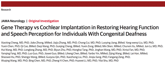 近日,复旦大学附属眼耳鼻喉科医院耳聋基因治疗团队发现耳畸蛋白缺陷(OTOF)基因治疗恢复患者自然听力,在噪声言语与音乐感知中比人工耳蜗表现更优。此研究是全球首个基因治疗与人工耳蜗的队列研究,发表于国际期刊《美国医学会·神经病学》(JAMA Neurology),论文题为《基因治疗与人工耳蜗植入在恢复先天性耳聋患者听觉功能和言语感知方面的比较》(“Gene Therapy vs Cochlear Implantation in Restoring Hearing Function and Speech Perception for Individuals with Congenital Deafness”)。该研究首次系统地比较了先天性耳聋儿童接受基因治疗与人工耳蜗植入后的多维度效果差异,由复旦大学附属眼耳鼻喉科医院、国家卫健委听觉医学重点实验室、上海市罕见病基因编辑与细胞治疗重点实验室(筹)的舒易来教授、李华伟教授、陈兵教授、王武庆教授团队领衔,联合哈佛大学医学院陈正一教授完成。
