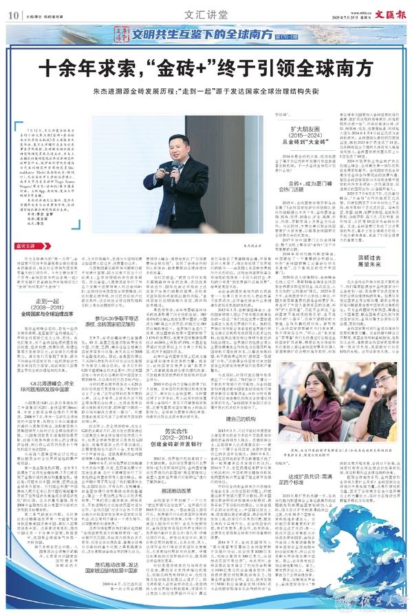 7月12日,文汇讲堂全球南方系列十讲之第五期《金砖+在全球南方的实践与挑战》在上海报业大厦举办,复旦大学国际关系与公共事务学院教授、金砖国家组织联合研究院研究员朱杰进主讲,并与上海国际问题研究院世界经济研究所副所长叶玉、俄罗斯科学院中国与当代亚洲研究所首席研究员Mamakhatov Tlesh(马马哈托夫·特列什)、巴西圣保罗大学政治学博士、南开大学历史系讲师Tiago Soares Nogara(蒂亚戈·诺加拉)展开圆桌对话。上观App、央视频、复旦大学视频号等直播。本期讲座由文汇报社、复旦大学国际关系与公共事务学院、金砖国家组织联合研究院联合主办。