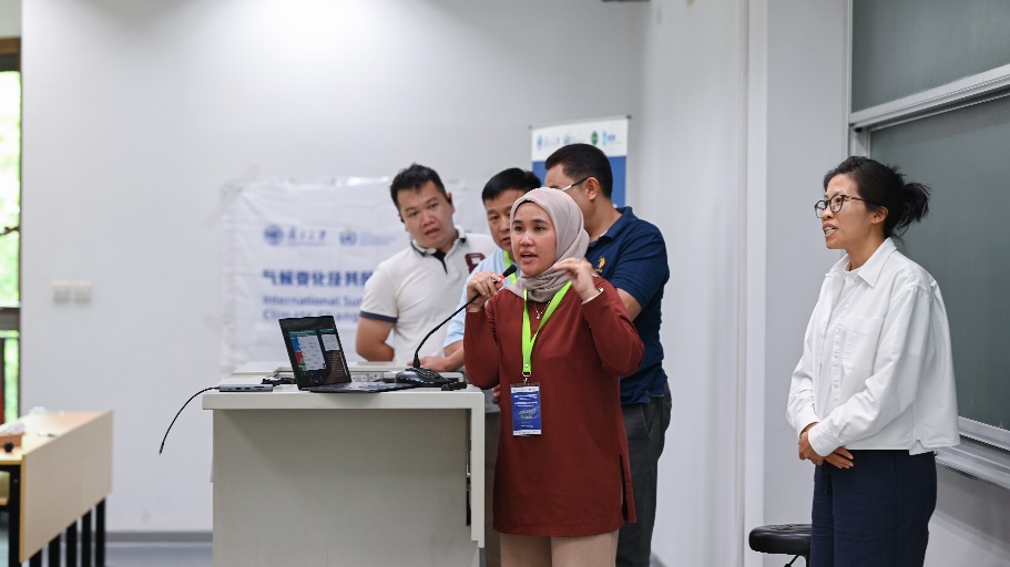 在随后的课程学习与实践环节,5名学员在复旦大学展开了丰富而深入的学习体验。除日常与导师进行技术交流外,学员们还参与了复旦大学2025“气候变化及其风险”国际暑期学校的专题课程,围绕“人类活动与极端天气气候事件”这一议题,系统学习了气候变化理论、前沿知识和协同治理的核心要素,进一步夯实了专业知识体系。与此同时,研修班学员积极参与小型研究项目(Mini-project)设计与研究活动并在课堂上分享了集体研究成果,受到了专家和学员的一致好评。