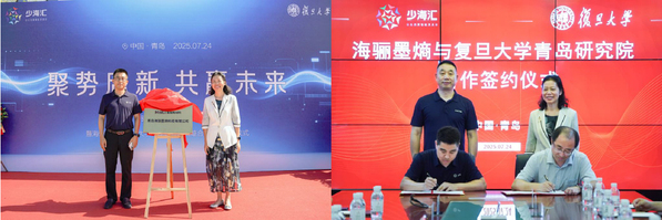 7月24日下午,常务副校长许征赴青岛调研期间,参观考察复旦大学化学系郭浩教授创办的科技企业——青岛海骊墨熵科技有限公司,亲自为该公司揭牌。考察期间,与海尔集团少海汇总裁刘斥共同见证了海骊墨熵与复旦大学青岛研究院战略合作协议的签署。