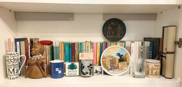 张军的书架上随机摆放着来自世界各地的纪念品