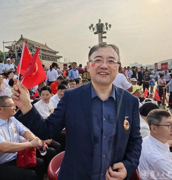 中国科学院院士、复旦大学校长、上海医学院院长金力,2025年“全国先进工作者”称号获得者、中山医院内镜中心主任周平红在天安门广场现场观礼。