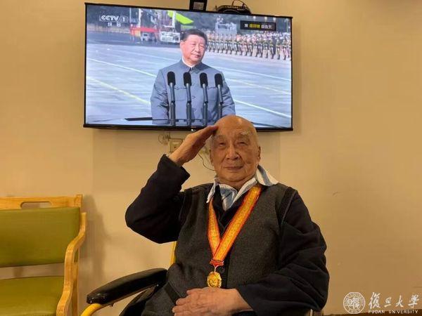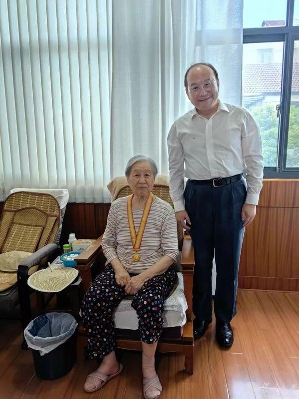 复旦大学党委副书记、上海医学院党委书记袁正宏代表学校,为103岁的离休干部汪枫叶颁发“中国人民抗日战争胜利80周年”纪念章,感谢他为民族解放和学校事业发展所作出的贡献,并祝愿他健康长寿。