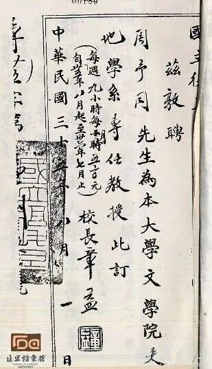 1943年任美锷授聘为史地学系专任教授及系主任聘书存根