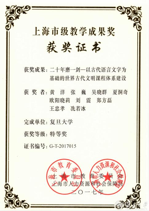 “二十年磨一剑——以古代语言文字为基础的世界古代文明课程体系建设”上海市教学成果奖特等奖证书