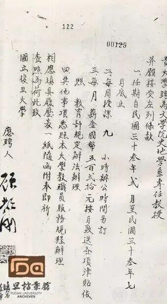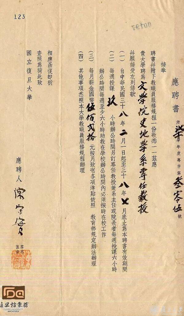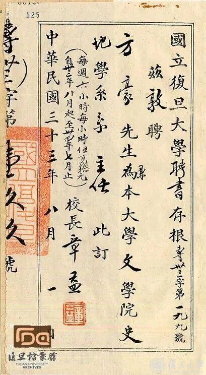 1937年抗战爆发。复旦内迁重庆北碚,设立史地学系。1942年,复旦由私立改为国立,大批名师来到史地学系授课或任教。在复旦大学档案馆留存的聘书存根中,赫然记录着顾颉刚、方豪、周谷城、任美锷、朱滶、周予同、陈守实等名字。