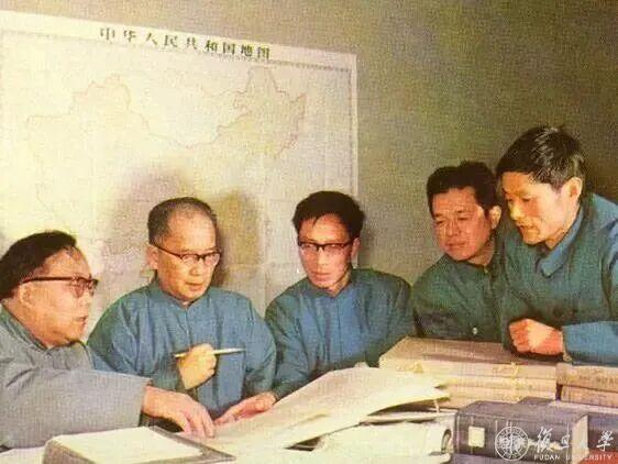 1970年代后期,谭其骧(左二)与历史地理研究室同事研究《中国历史地图集》修订事宜