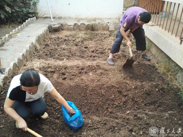 周坚(右)在医院墙角开荒种菜